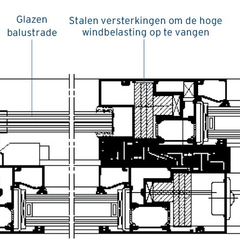 - Verschillende stalen versterkingen werden aangebracht op de binnenkant van de profielen om te weerstaan aan de hoge windbelasting